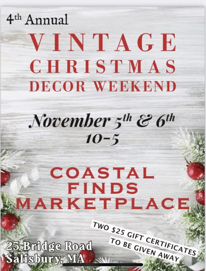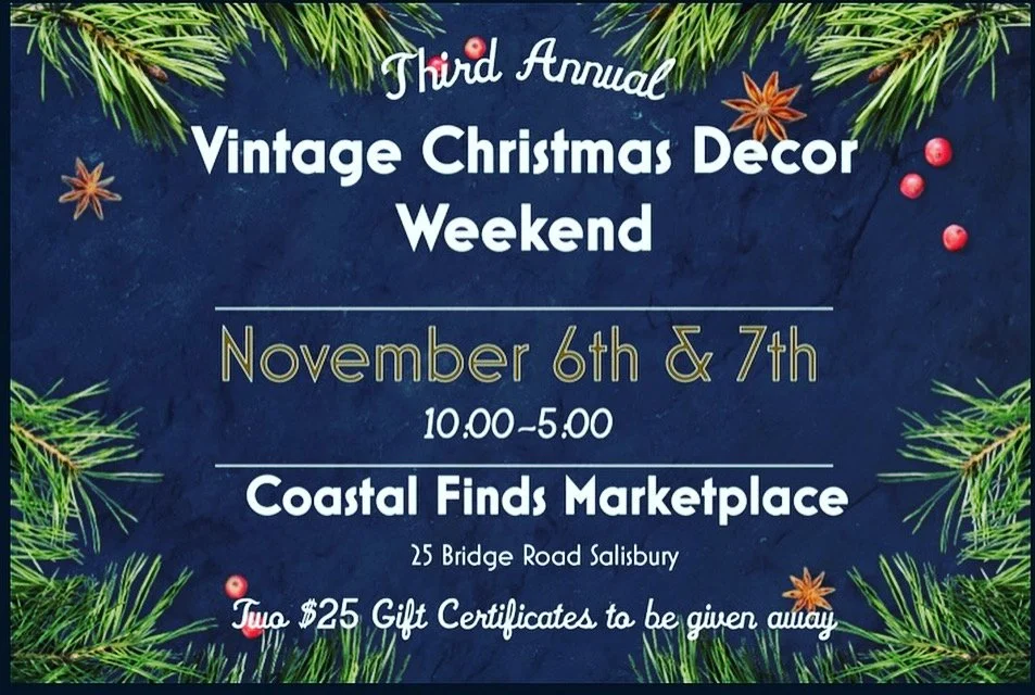 Please join us for our 1st annual Vintage Christmas Decor Weekend event. There will be lots of vintage christmas items as well as new christmas decor. Handmade wreaths,sleds,soap,candles,furniture,ocal food itmes & decorative accessories from over 30 vendors & artists will participate in making your stop at Coastal Finds Marketplace a memorable experience.